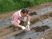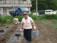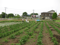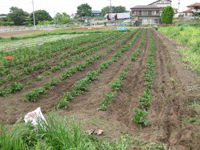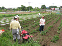 5月3日(日)じゃがいもクラブは小雨の中、去る3月15日に植えたジャガイモの草取りと枝豆の種を蒔きました。連休中にも拘わらず多くのメンバーが出席、L.赤坂は初めて豆トラの運転を体験、L.浅子もトラクターを運転、見る見るうちに除草、種蒔を終えることが出来ました。 |