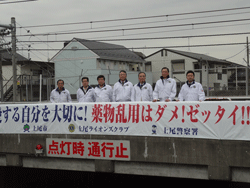 上尾ライオンズクラブ・街づくり委員会は、クラブメンバーの作成した標語をもとに作成した「薬物乱用防止」、「復興支援」「自転車事故防止」を呼びかける横断幕を上尾市、上尾警察署の協力を得て作成、上尾警察、上尾駅東口デッキ、JR高崎線アンダーパスの三箇所に設置いたしました。 この横断幕は、今後も他の場所に移動設置し、市民への協力を呼びかけて行きます。
